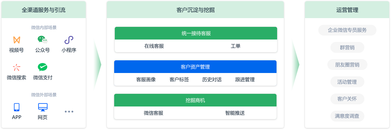 微信全场景一链接入,沟通服务全面触达,业务问题智能处理,咨询用户统一平台接触,挖掘微信生态流量价值
